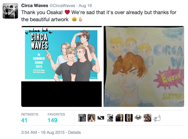 Colin: Yes. We got two from Japan, which was insane. Someone held a sign up in Summer Sonic in Japan, which said, “Take this, please!” and I was looking at it through the show going, “What is that? I don’t have a clue.” So our sound guy got it and came back and it was just this amazing drawing of all four of us.